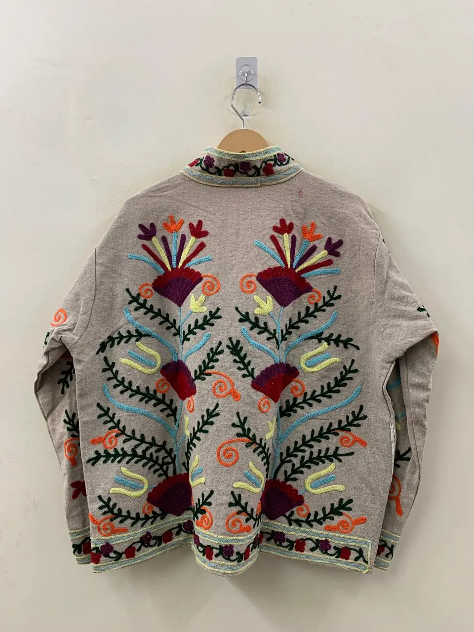 Unique boho cotton Suzani jacket designed with floral ethnic embroidery. Comfortable fit and eye-catching style for everyday fashion.