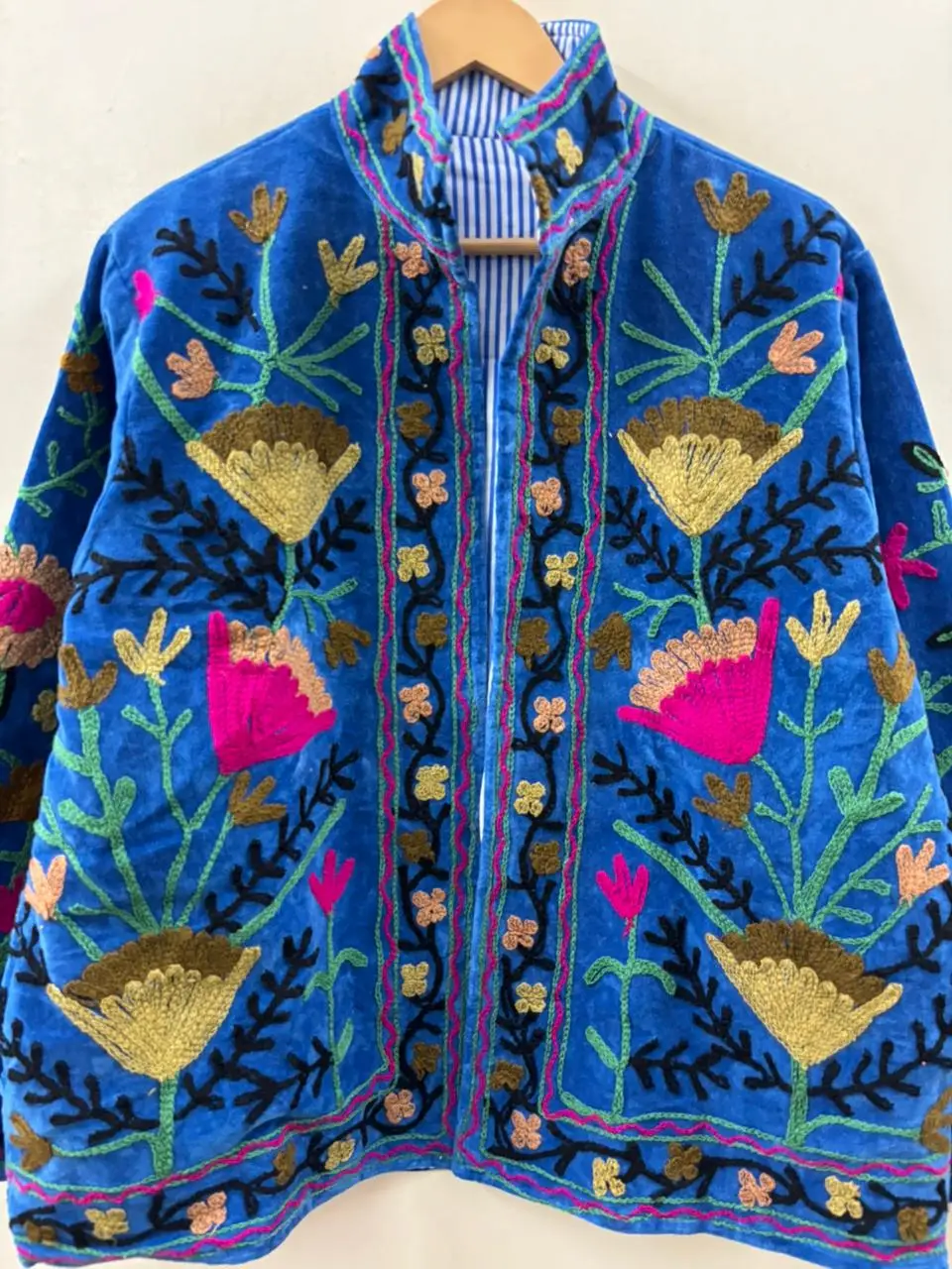 Bohemian-inspired velvet Suzani jacket with vibrant handcrafted embroidery.