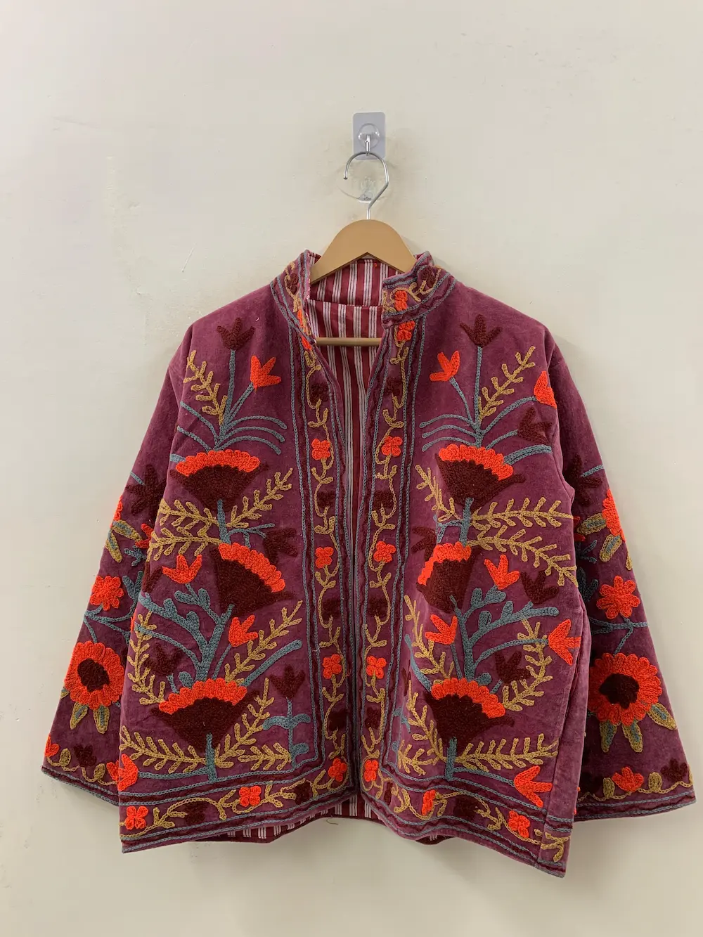 Elevate your wardrobe with our stunning Velvet Suzani Jacket, a perfect fusion of traditional craftsmanship and modern fashion. Designed for women who love unique statement pieces, this jacket features intricate Suzani embroidery inspired by rich cultural heritage.