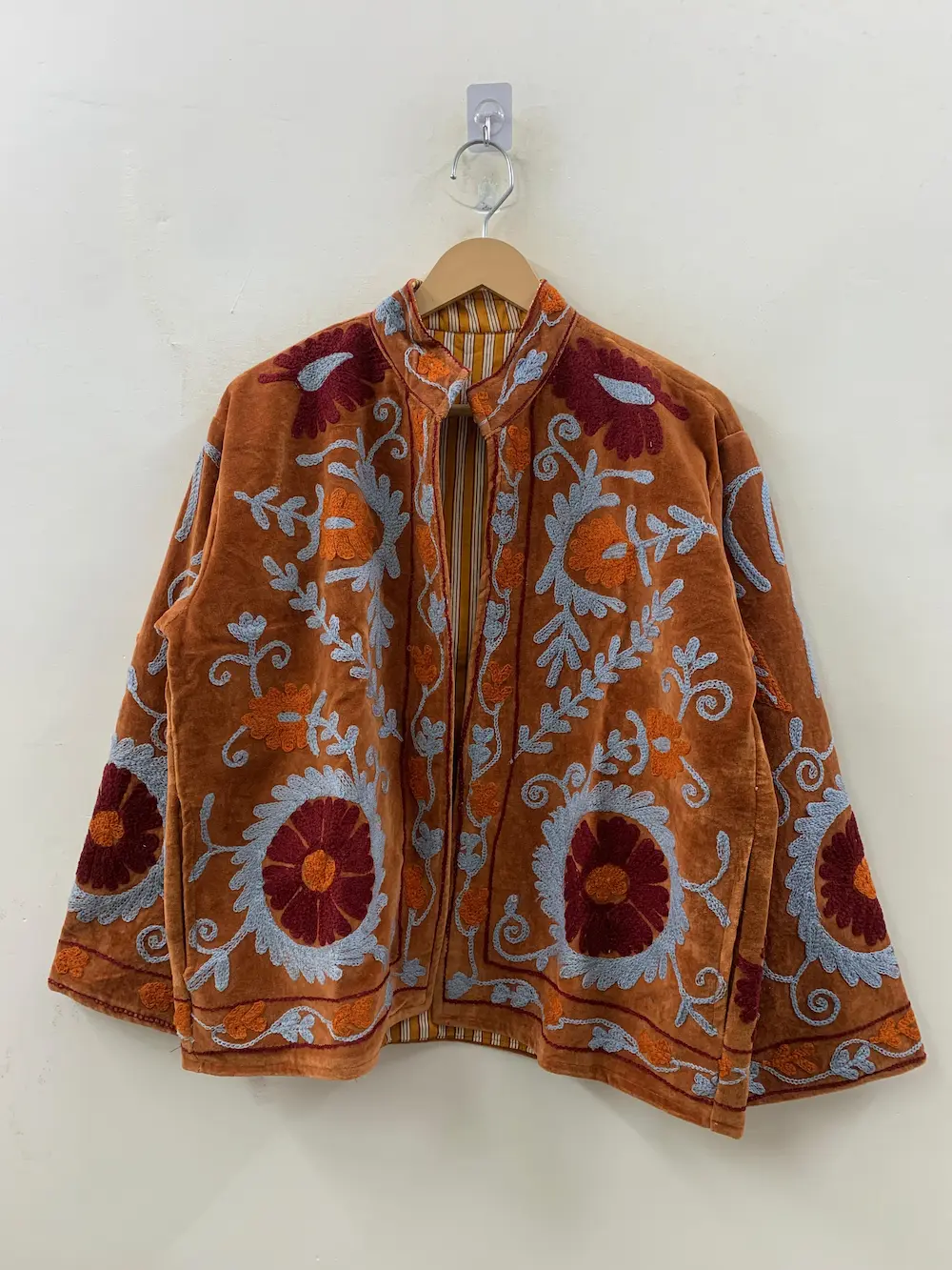 Crafted from premium-quality velvet, this jacket offers a luxurious feel and a flattering silhouette. The detailed hand embroidery adds a vibrant, artistic touch, making each piece truly one-of-a-kind. Whether you're dressing up for a festive occasion or adding a boho-chic vibe to your everyday outfit, this jacket effortlessly enhances your look.